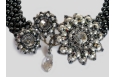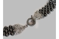 Four strands of smoky black Swarovski pearls are woven in a right angle weave stitch with champagne hematite Charlotte seed beads as enhancement. The necklace is finished with decorative filigreed ends and a crystal pave toggle clasp.