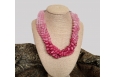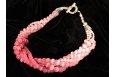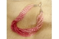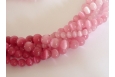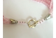 Cat’s Eye beads are glass beads with a fiber optic-like center which reflects light. This design uses six strands of graduated sizes in pinks from light to raspberry in a multi-strand necklace. The weight is supported by sturdy pea blossom shaped end caps and a pewter toggle clasp.