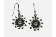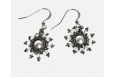 Small starry pendants stitched with tiny hematite charlottes around a Swarovski Light Grey crystal pearl with 3mm Swarovski clear crystal picots on gun-metal earring wires.